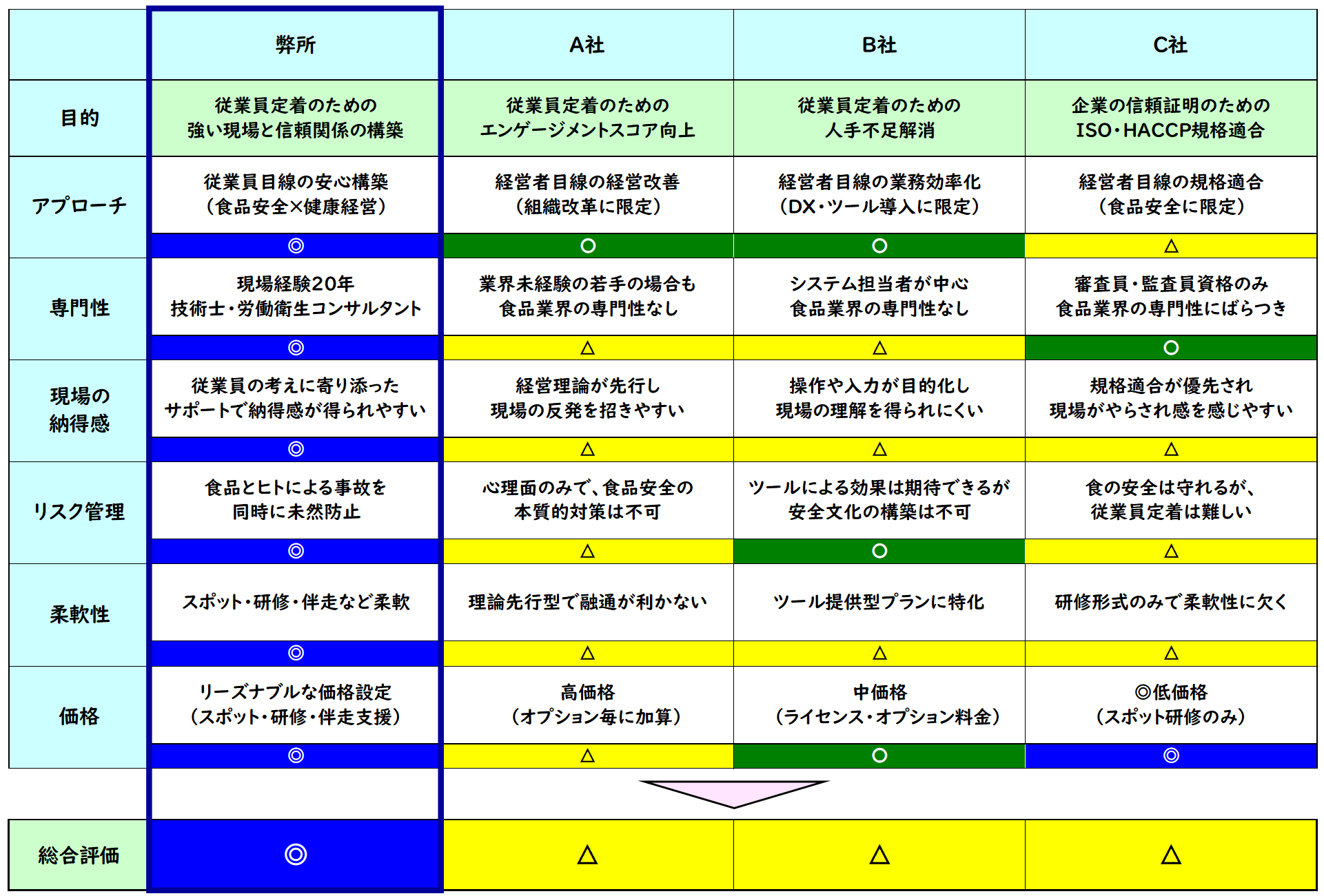 従業員1人の採用には108万円のコストがかかります。弊所は「従業員定着」のために「食品安全」や「健康経営」を1人のコンサルタントでご支援できる「日本で唯一の事務所」です。従業員が生き生きと働き企業利益を最大化するための「従業員定着のための7つの力」を独自メソッドとして体系化し高い支持を得ているのも選ばれる理由となっています。
