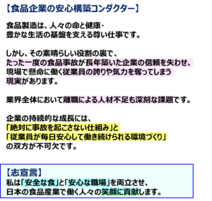 食品事故は食品企業特有のリスクで、従業員の生活にダイレクトに影響します。事故のリスクと脅威に対して、仕組みづくりと人材育成でしっかりと備えます。